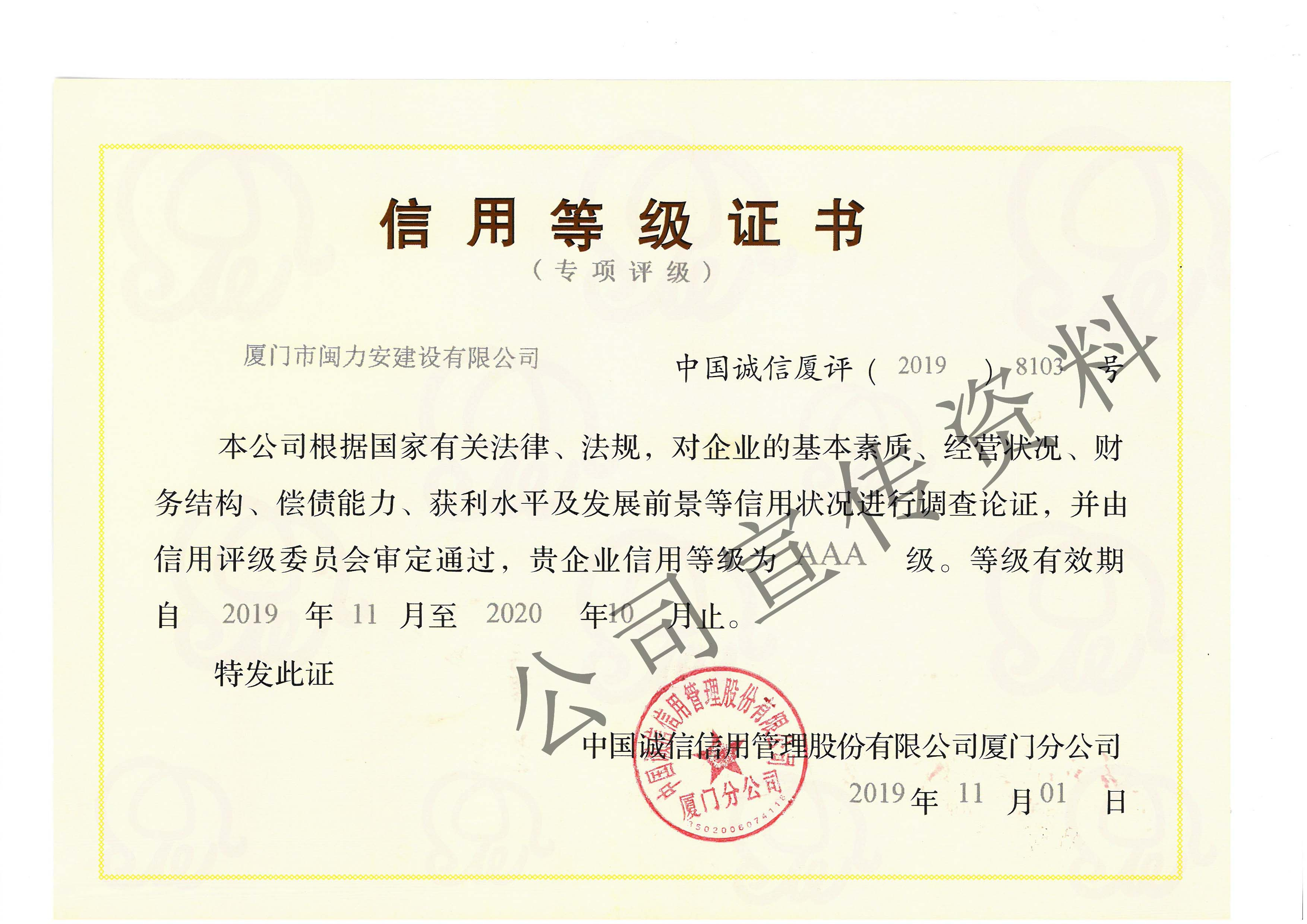 廈門市閩力安建設(shè)有限公司成立于2003年,公司取得市政公用工程施工總承包貳級、建筑裝修裝飾工程專業(yè)承包壹級、城市及道路照明工程專業(yè)承包壹級、電子與智能化工程專業(yè)承包貳級、消防設(shè)施工程專業(yè)承包貳級、電力工程施工總承包叁級、建筑機(jī)電安裝工程專業(yè)承包叁級、輸變電工程專業(yè)承包叁級、環(huán)保工程專業(yè)承包叁級、照明工程設(shè)計專項甲級、建筑裝飾工程設(shè)計乙級、施工勞務(wù)等資質(zhì)的綜合型企業(yè),公司于2013年通過了ISO9001質(zhì)量體系認(rèn)證,ISO14001環(huán)境管理體系認(rèn)證,OHSAS18001職業(yè)健康安全管理體系認(rèn)證。